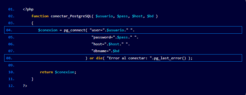 En este puno crearemos una conexión a la base de datos para lo cual implementaremos el siguiente código, en el cual se muestra una función llamada “conectar_PostgreSQL” que recibe como parámetros $usuario, $pass, $host, $bd Donde los primeros 2 argumentos fueron creados por el usuario, host es por lo general el nombre del equipo o “localhost” y bd es “MyDB”.